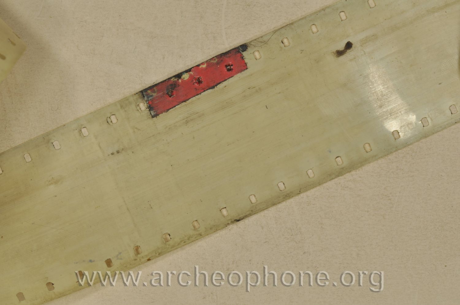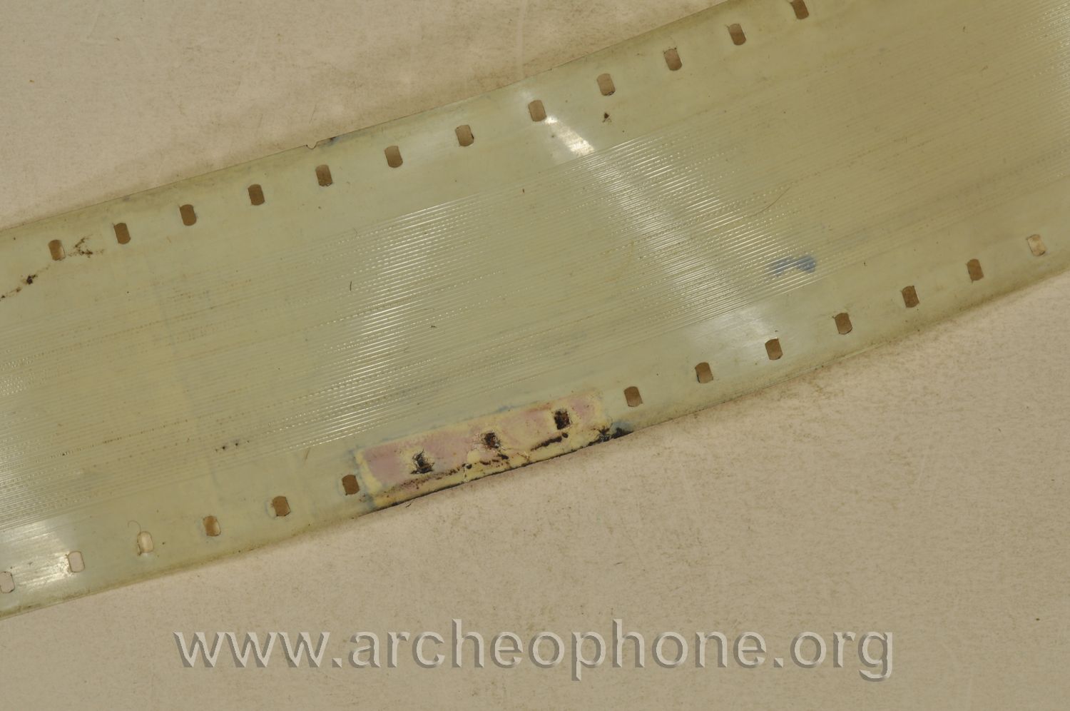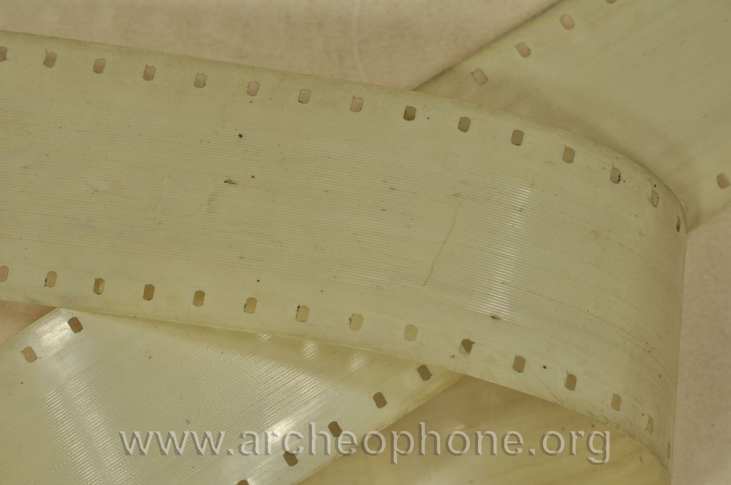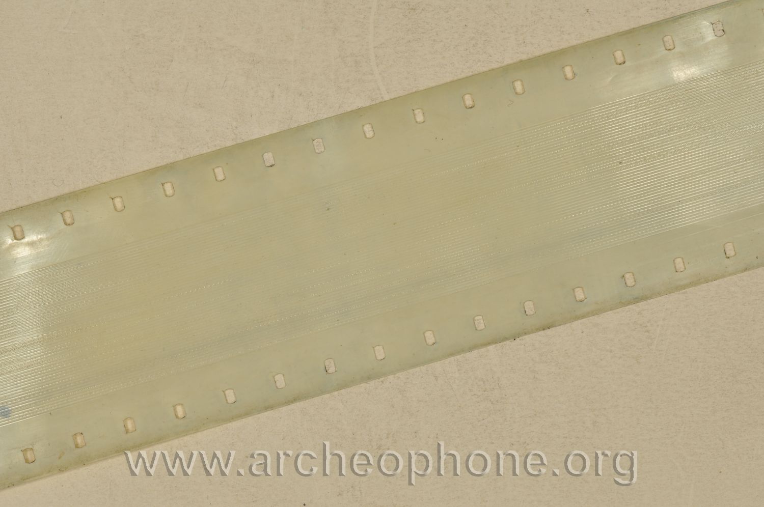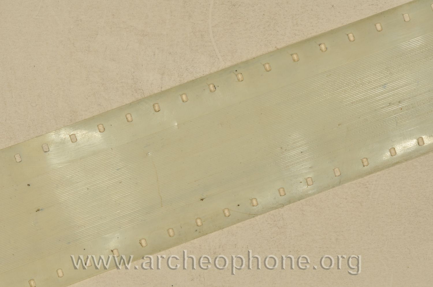 | Commentaires : | Paroles non transcrites. Cette bande d'une horloge parlante comporte 48 annonces d'heure, de 12h00 à 11h45, dans un ordre décroissant : 11h45, 11h30, 11h15, 11h00, 10h45, 10h30, 10h15, 10h00, 9h45, 9h30, 9h15, 9h00, 8h45, 8h30, 8h15, 8h00, 7h45, 7h30, 7h15, 7h00, 6h45, 6h30, 6h15, 6h00, 5h45, 5h30, 5h15, 5h00, 4h45, 4h30, 4h15, 4h00, 3h45, 3h30, 3h15, 3h00, 2h45, 2h30, 2h15, 2h00, 1h45, 1h30, 1h15, 1h00, 12h45, 12h30, 12h15, 12h00. La vitesse linéaire correcte avoisine les 38cm/s. Elle s'obtient sur mandrin Dictabelt à 75 rpm, soit pour la bande elle-même, 24 tours-minute environ. La bande est un film de celluloïd d'un blanc laiteux (il existe des versions transparentes), de 12/100e à 15/100e de mm d'épaisseur. Elle mesure 48 mm de large et 945 mm de longueur, et porte une double perforation de 100 perforations à chaque bord. Quatre perforations sont superposées pour l'enroulement et fixation par boutons pression. En somme, le diamètre utile porte sur 96 perforations. On compte 20 entre-axes de perforations sur 180 mm, c'est-à-dire un entre-axe de 9,47 mm entre chaque perforation. Le filetage est celui d'un cylindre normal. La piste comporte 48 spires pour 25 mm au total. Elle commence à 11 mm d'un bord et s'achève à 12 mm de l'autre bord. |