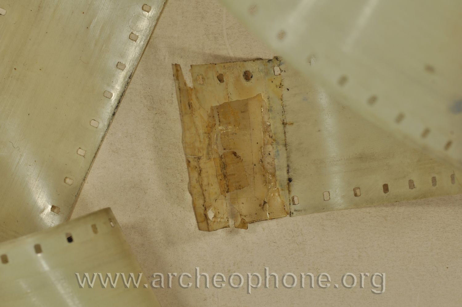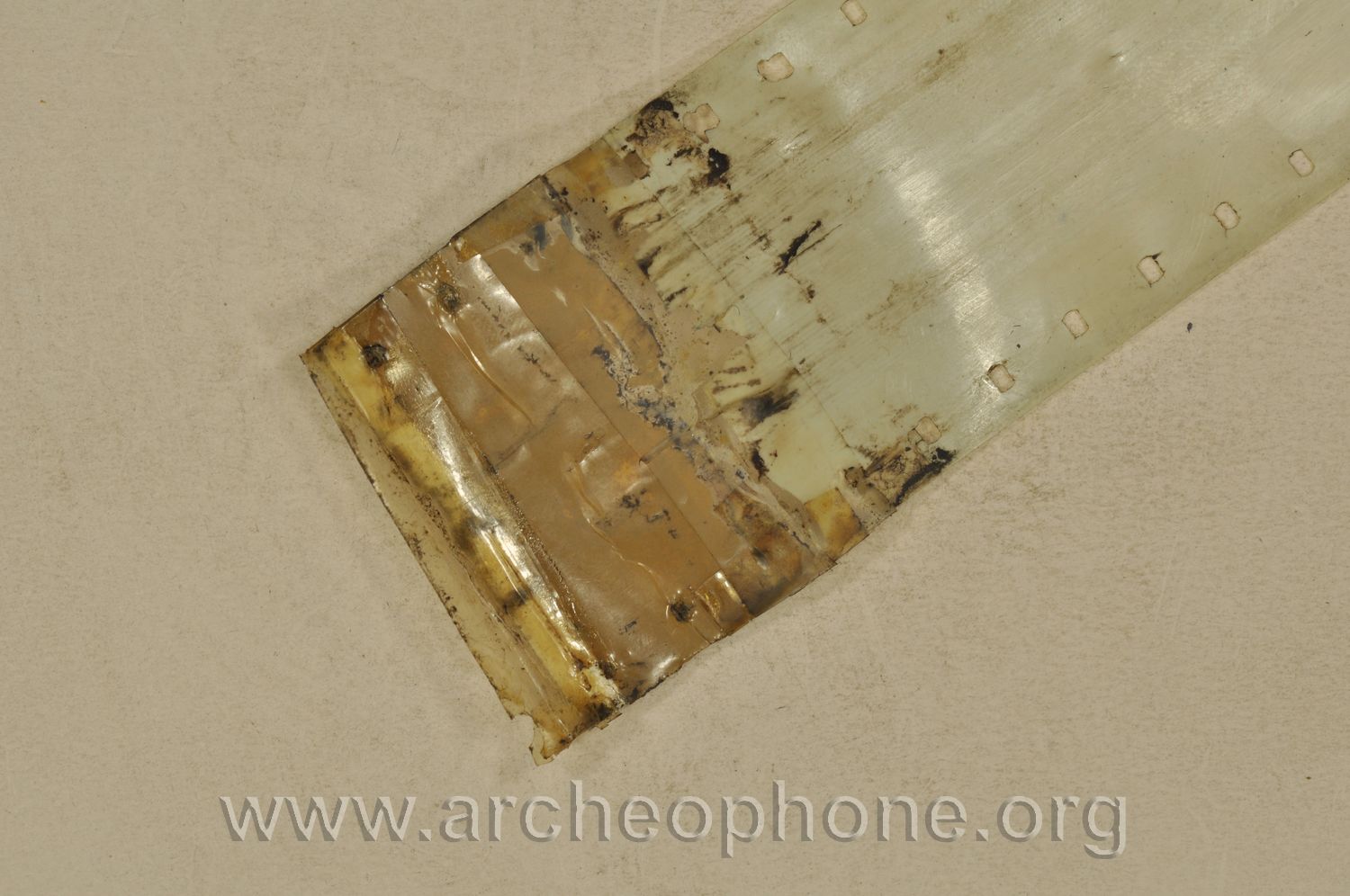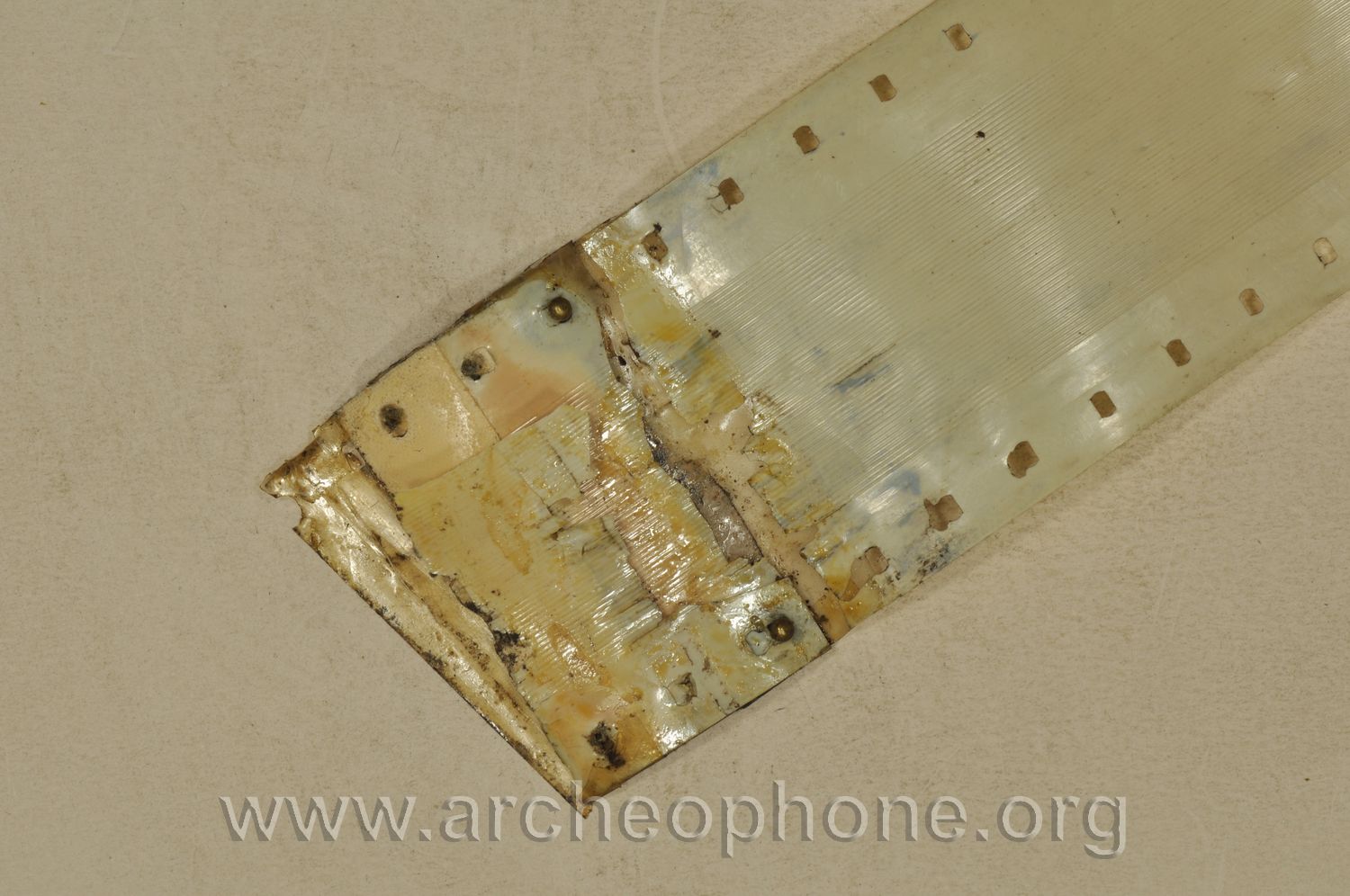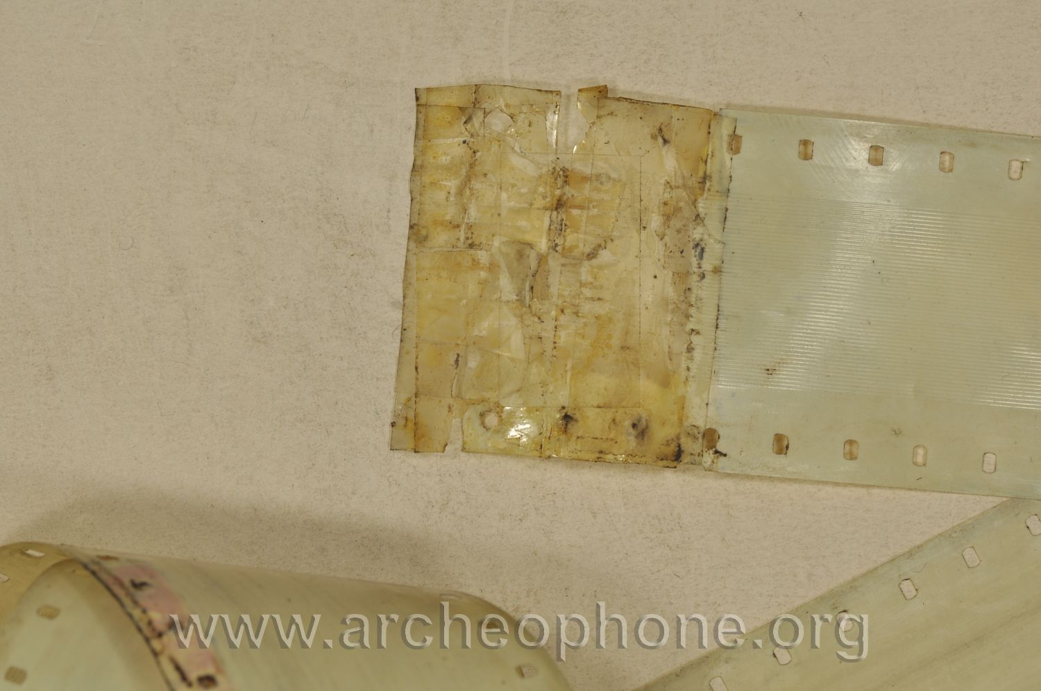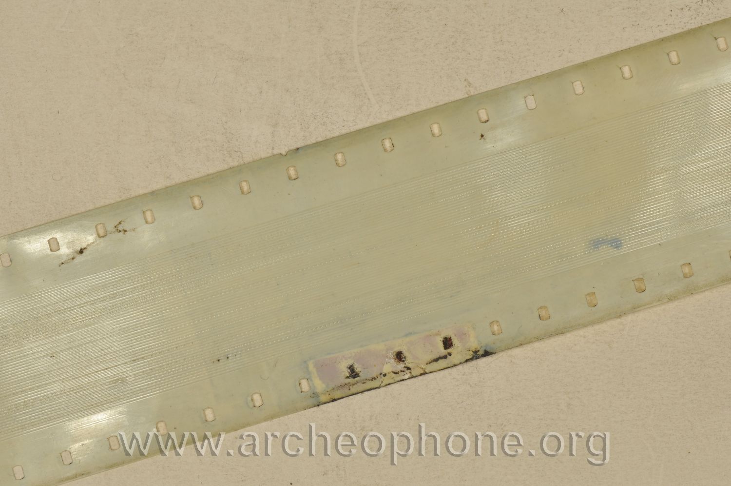 | Commentaires : | Paroles non transcrites. Cette bande d'une horloge parlante comporte 48 annonces d'heure, de 12h00 à 11h45, dans un ordre décroissant : 11h45, 11h30, 11h15, 11h00, 10h45, 10h30, 10h15, 10h00, 9h45, 9h30, 9h15, 9h00, 8h45, 8h30, 8h15, 8h00, 7h45, 7h30, 7h15, 7h00, 6h45, 6h30, 6h15, 6h00, 5h45, 5h30, 5h15, 5h00, 4h45, 4h30, 4h15, 4h00, 3h45, 3h30, 3h15, 3h00, 2h45, 2h30, 2h15, 2h00, 1h45, 1h30, 1h15, 1h00, 12h45, 12h30, 12h15, 12h00. La vitesse linéaire correcte avoisine les 38cm/s. Elle s'obtient sur mandrin Dictabelt à 75 rpm, soit pour la bande elle-même, 24 tours-minute environ. La bande est un film de celluloïd d'un blanc laiteux (il existe des versions transparentes), de 12/100e à 15/100e de mm d'épaisseur. Elle mesure 48 mm de large et 945 mm de longueur, et porte une double perforation de 100 perforations à chaque bord. Quatre perforations sont superposées pour l'enroulement et fixation par boutons pression. En somme, le diamètre utile porte sur 96 perforations. On compte 20 entre-axes de perforations sur 180 mm, c'est-à-dire un entre-axe de 9,47 mm entre chaque perforation. Le filetage est celui d'un cylindre normal. La piste comporte 48 spires pour 25 mm au total. Elle commence à 11 mm d'un bord et s'achève à 12 mm de l'autre bord. |