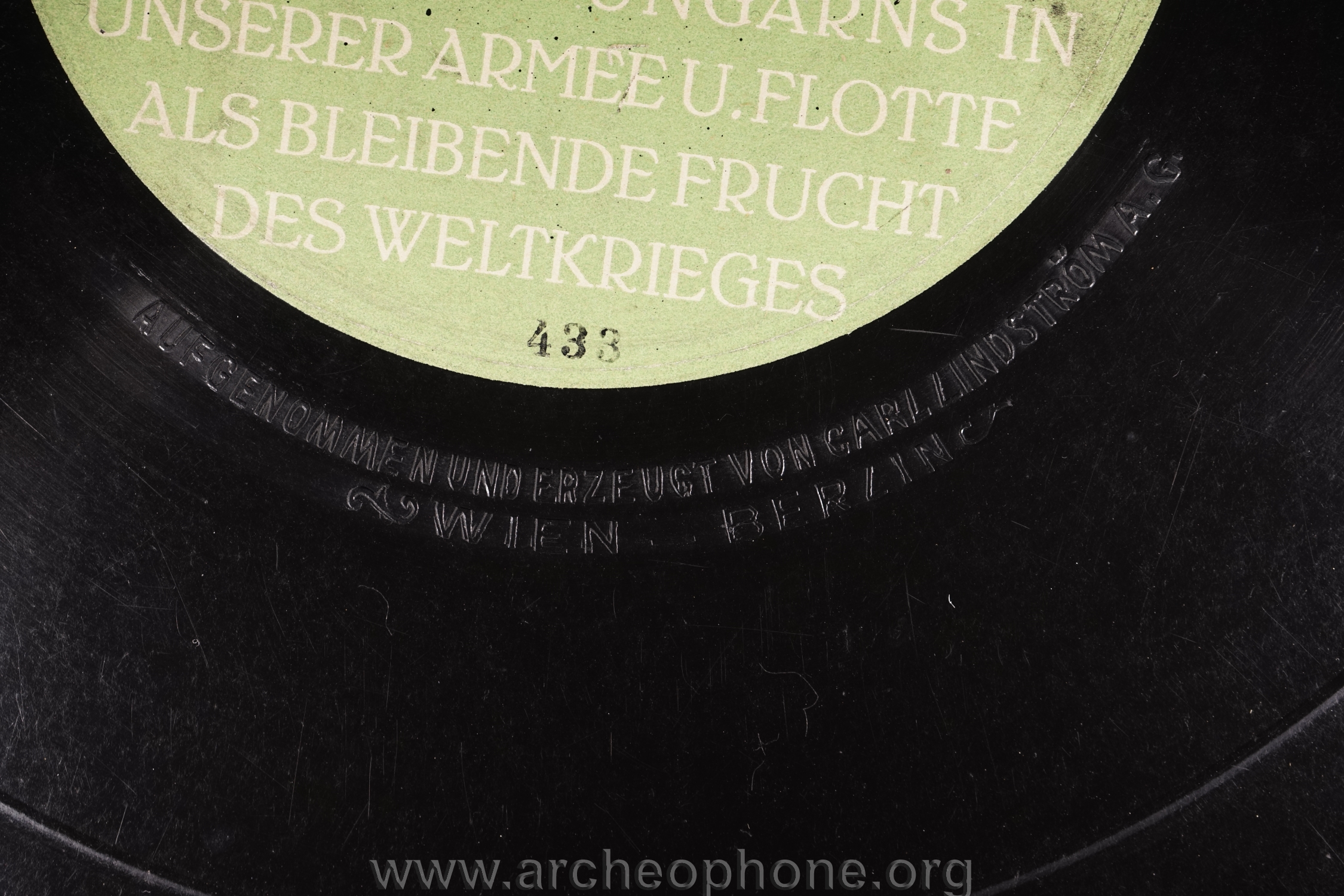 Paroles non transcrites. Franz Konrad von Hotzendorf, chef d'état-major de l'armée royale de impériale austro-hongroise de 1906 à 1918 fut un acteur de l'alliance de l'Autriche-Hongrie avec le Reich Allemand. Traduction du titre : Son Excellence, le colonel général, chef d'état-major général, Franz Freiherr Konrad von Hotzendorf : Discours sur la solidarité indissoluble de tous les peuples d'Autriche-Hongrie envers notre armée et notre marine, fruit durable de la Guerre mondiale. Au revers : Es ist nicht gestattet, diese Platte in offentlichen Lokalen vor-zuführen. Übertrettungenwerden strafechtlich verfolgt. = Ce disque ne peut être diffusé dans les lieux publics. Toute infraction sera poursuivie.