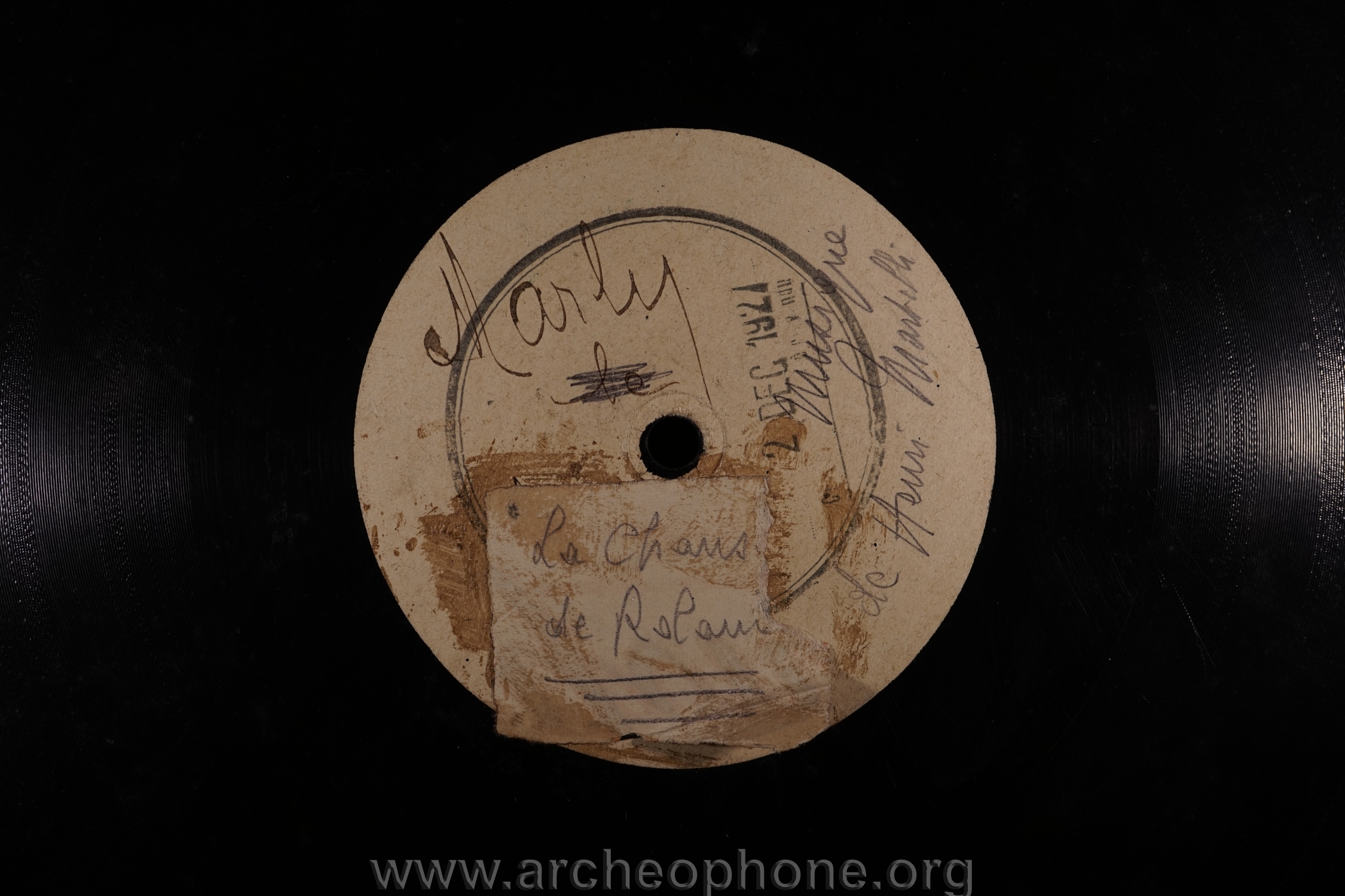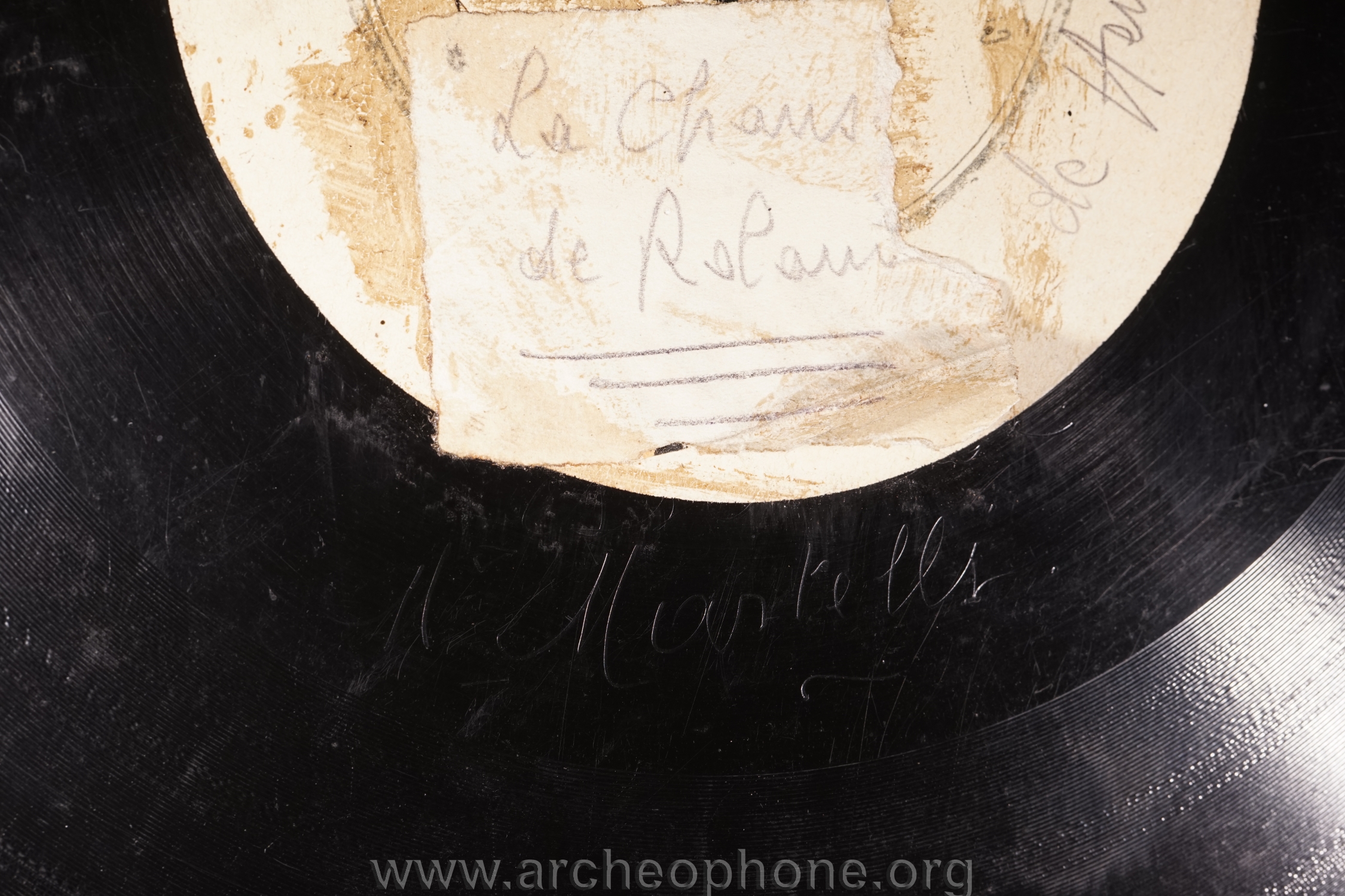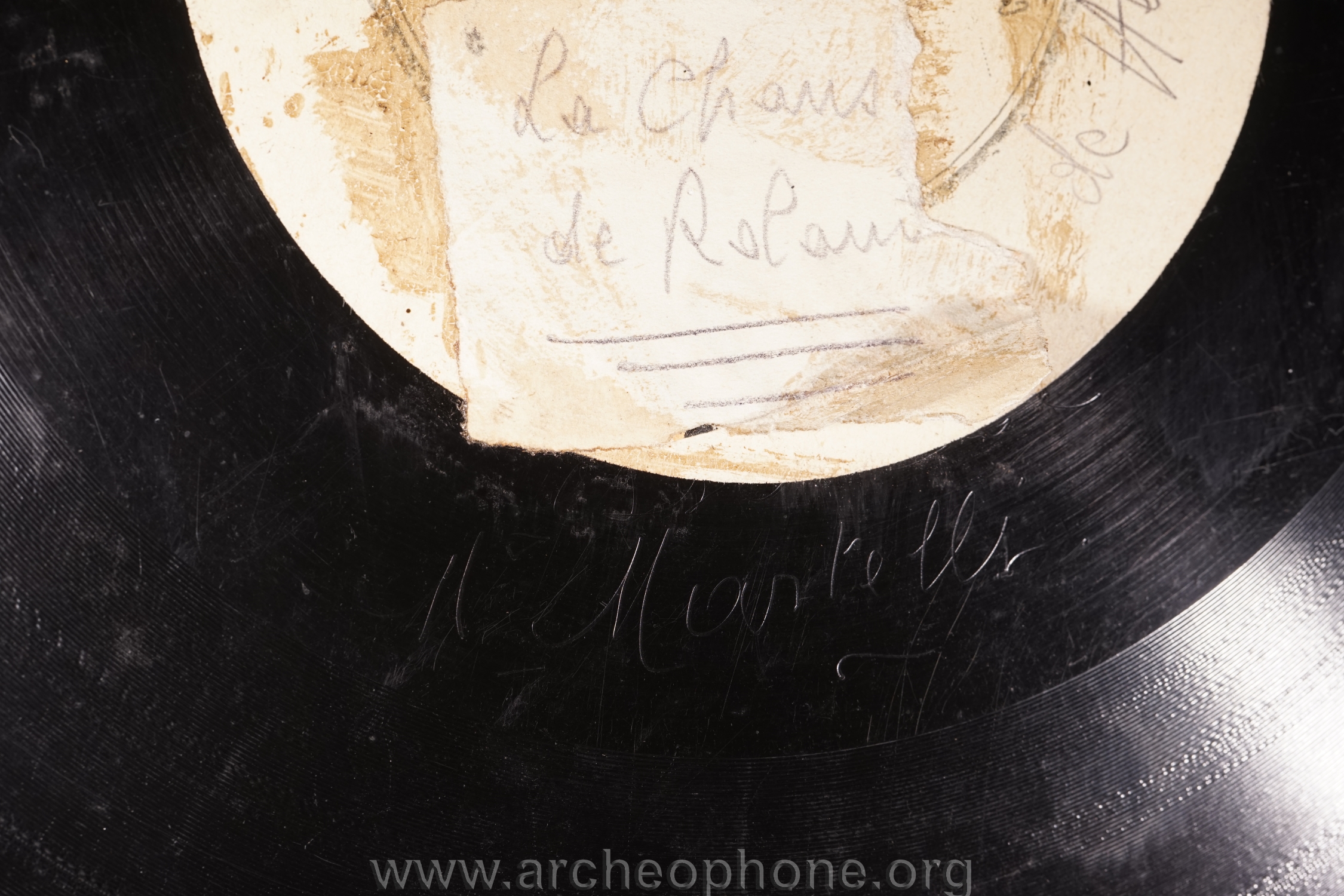 On lit, dans la zone entre sillon et étiquette : Musique moderne - Essai de Mr. Martelli - 25 nov. 1927. On lit sur l'étiquette : [manuscrit à l'encre:] Marly le [au tampon:]2 dec 1927 [au crayon:] La chanson de Roland.