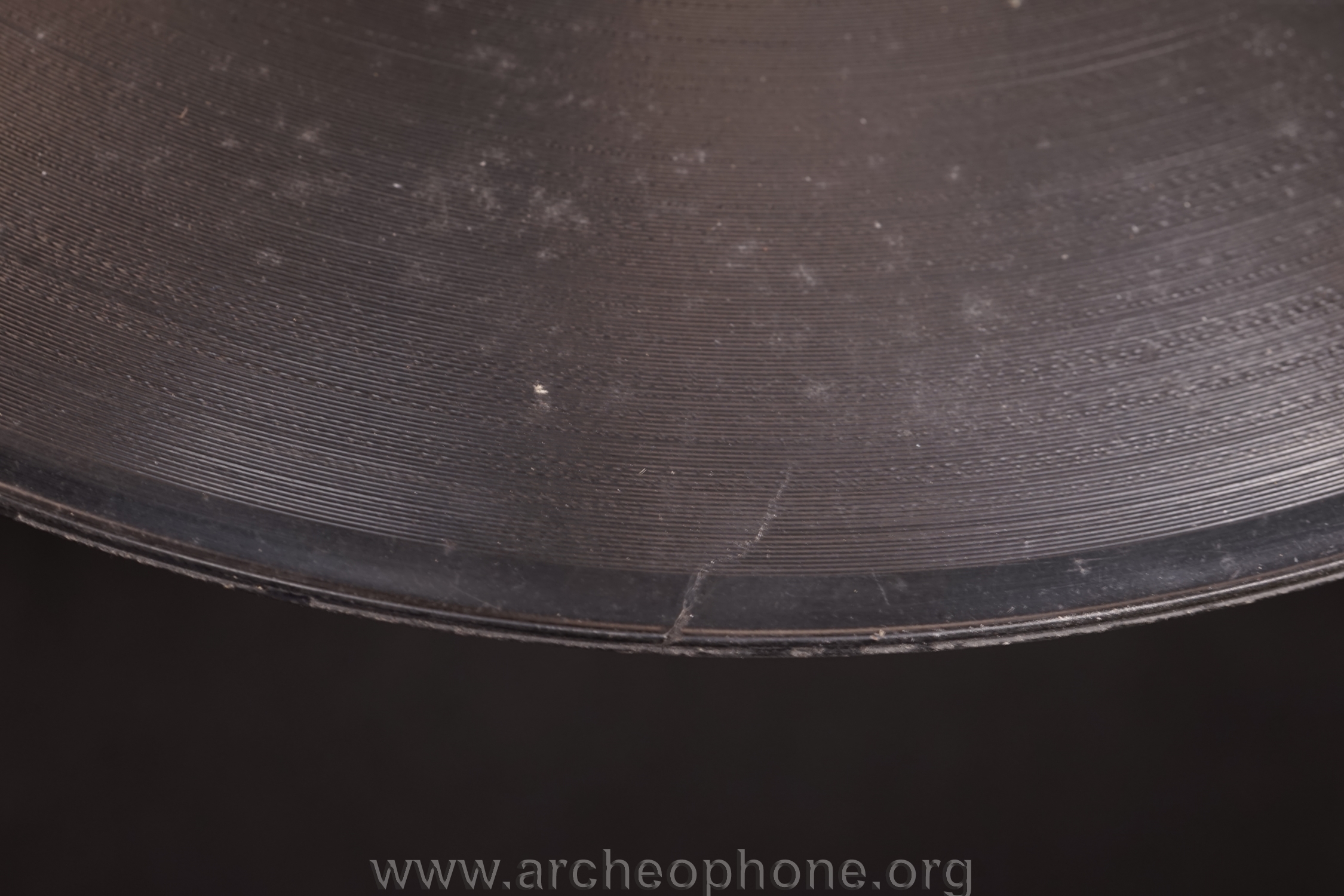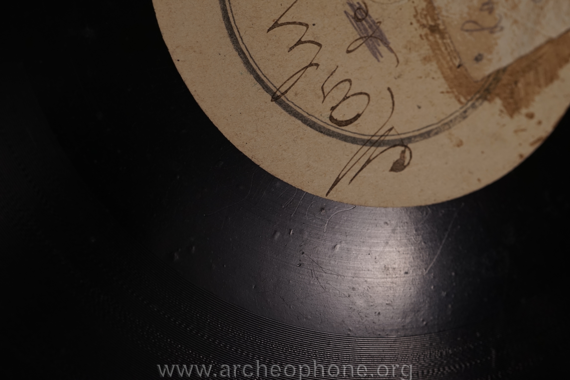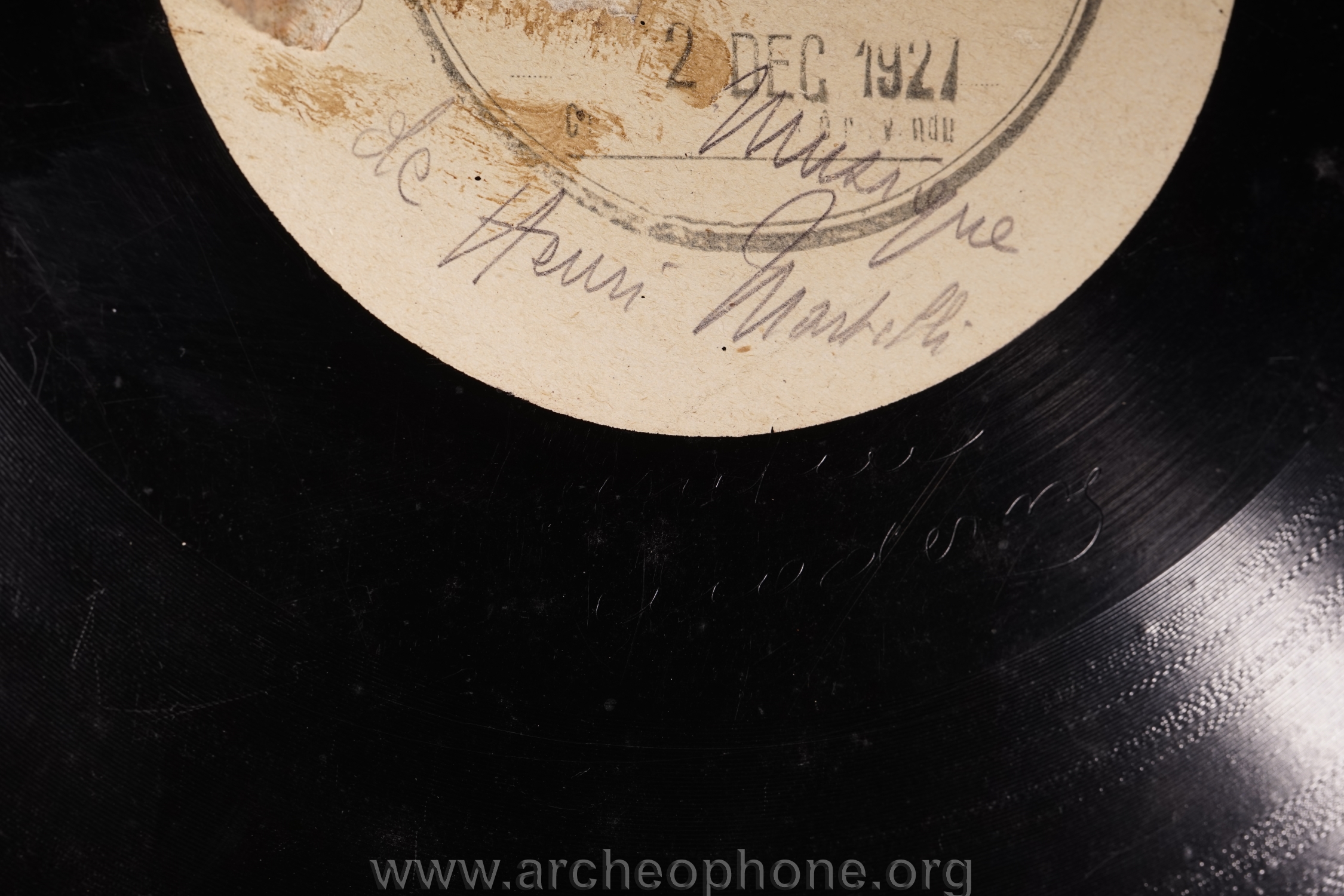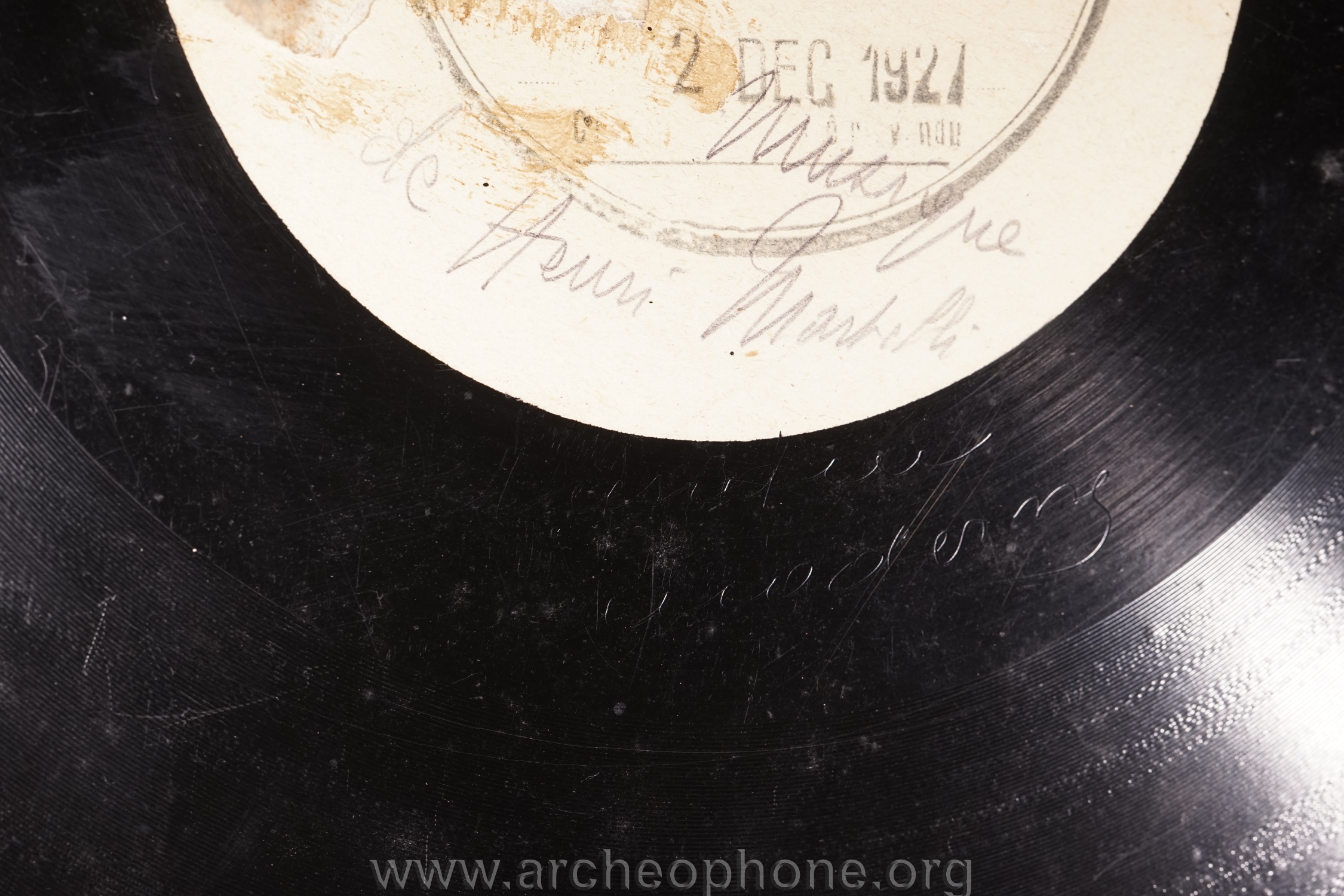 On lit, dans la zone entre sillon et étiquette : Musique moderne - Essai de Mr. Martelli - 25 nov. 1927. On lit sur l'étiquette : [manuscrit à l'encre:] Marly le [au tampon:]2 dec 1927 [au crayon:] La chanson de Roland.