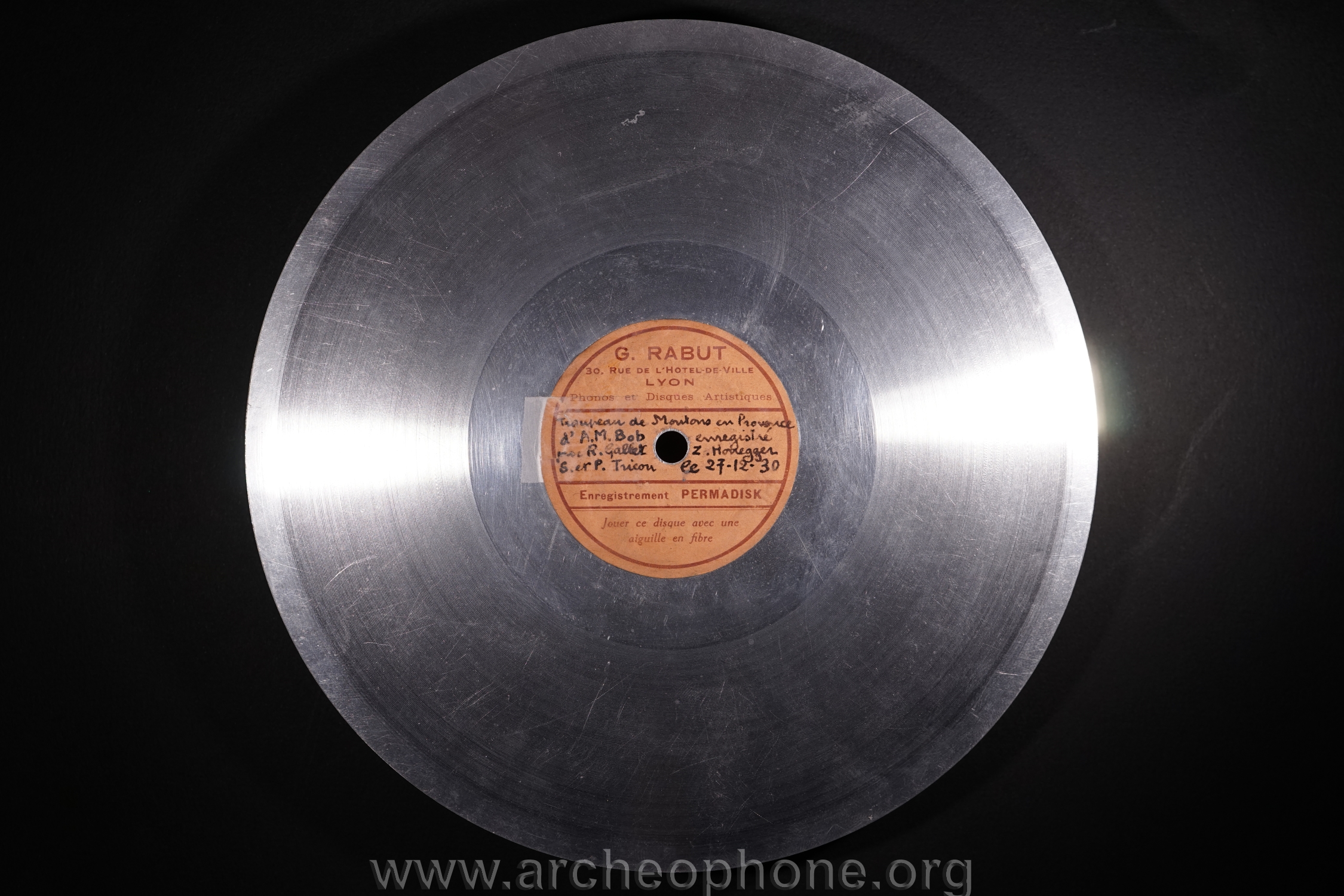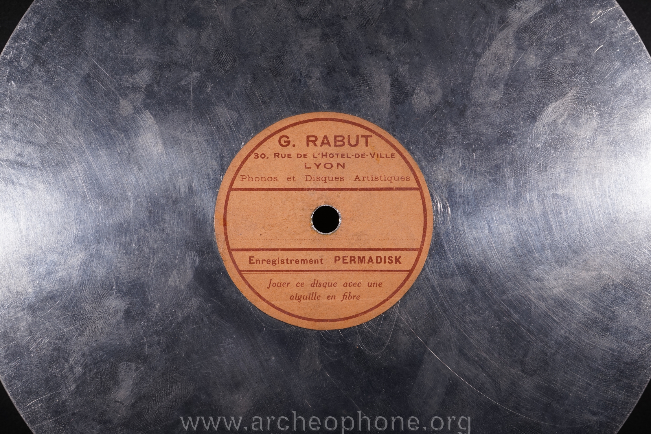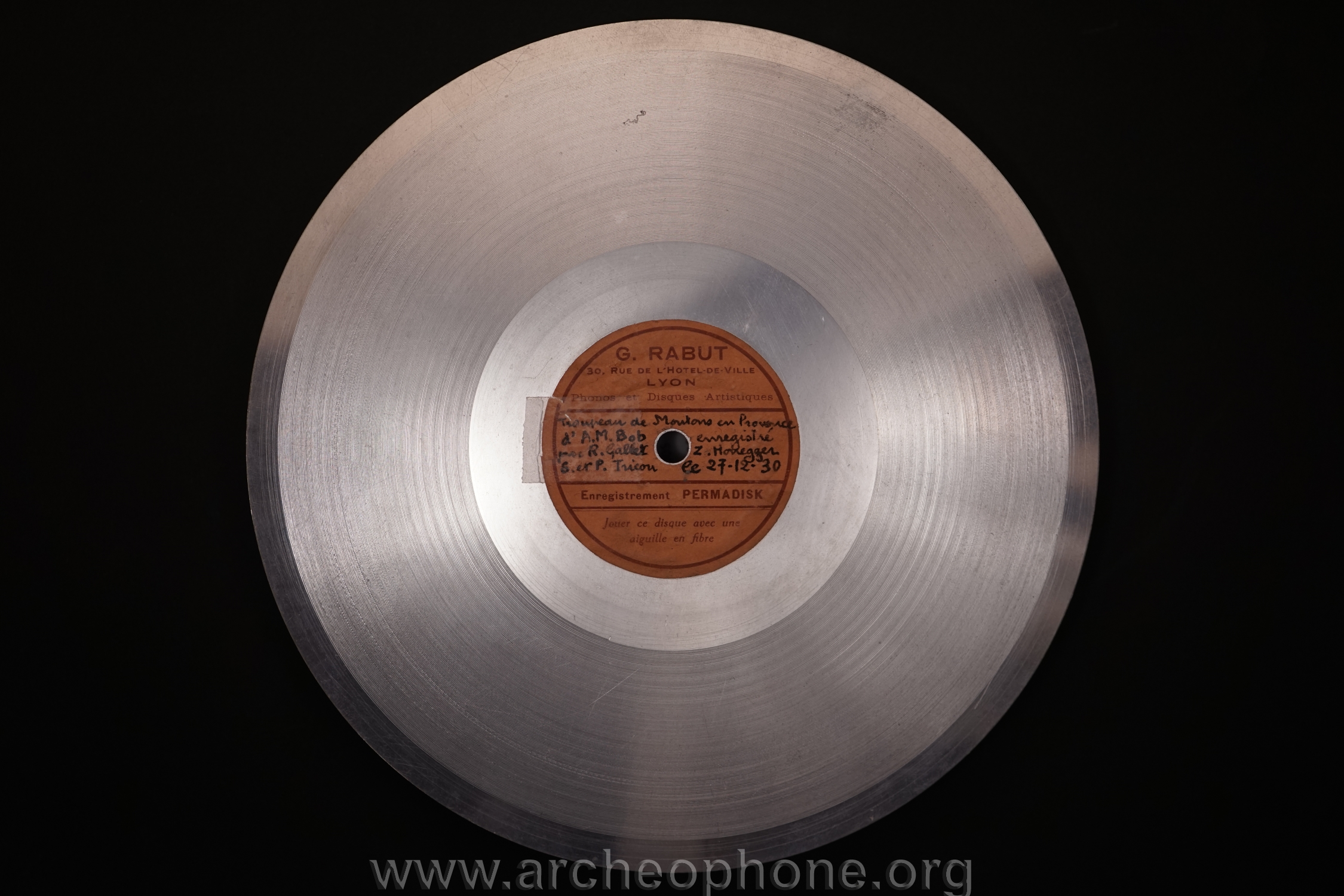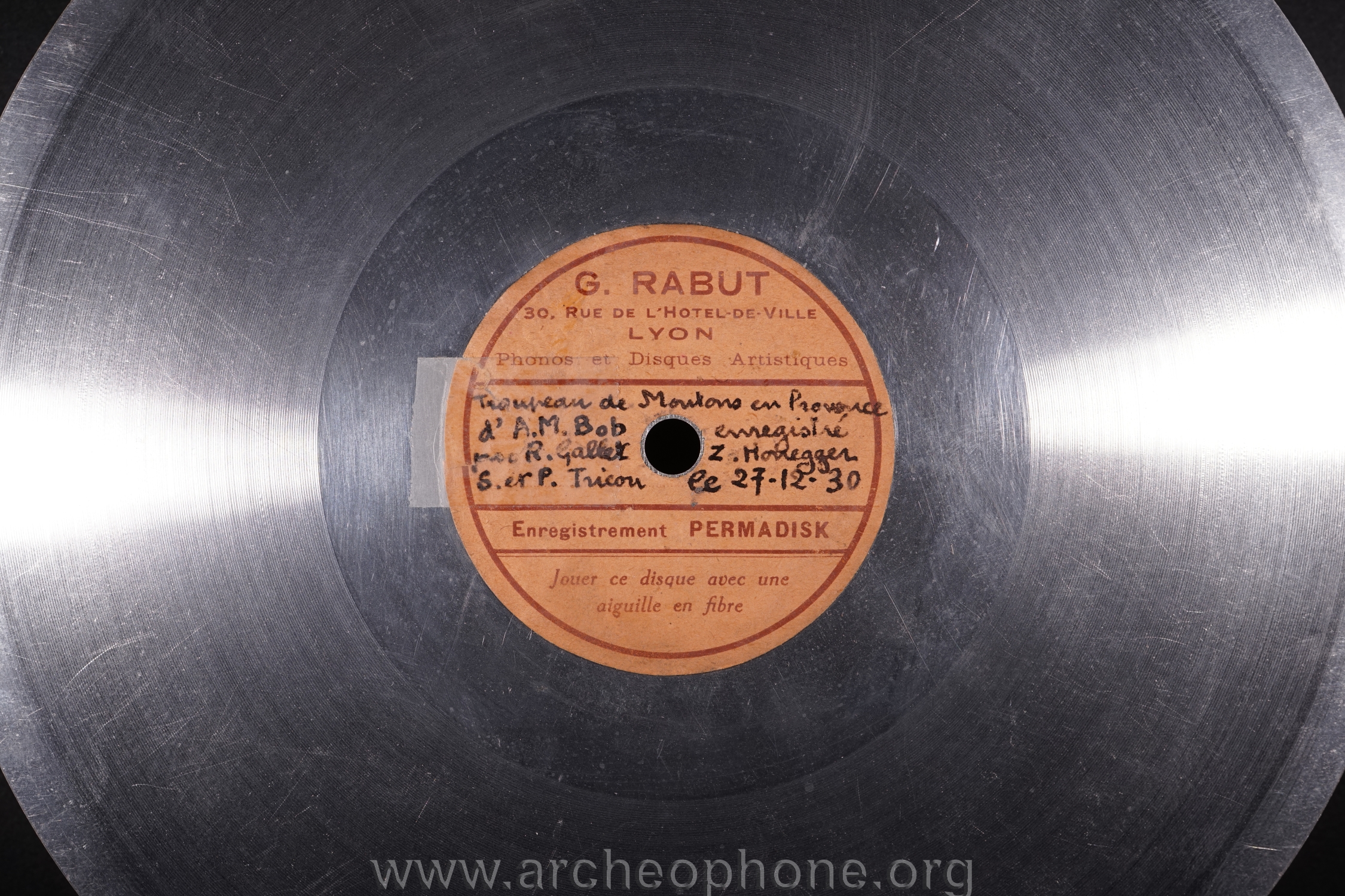 | Marque de fabrique, label : | Permadisk - G. Rabut 30 rue de l'Hôtel de ville Lyon Phonos et disques artistiques. Enregistrement Permadisk. Jouer ce disque avec une aiguille en fibre. |