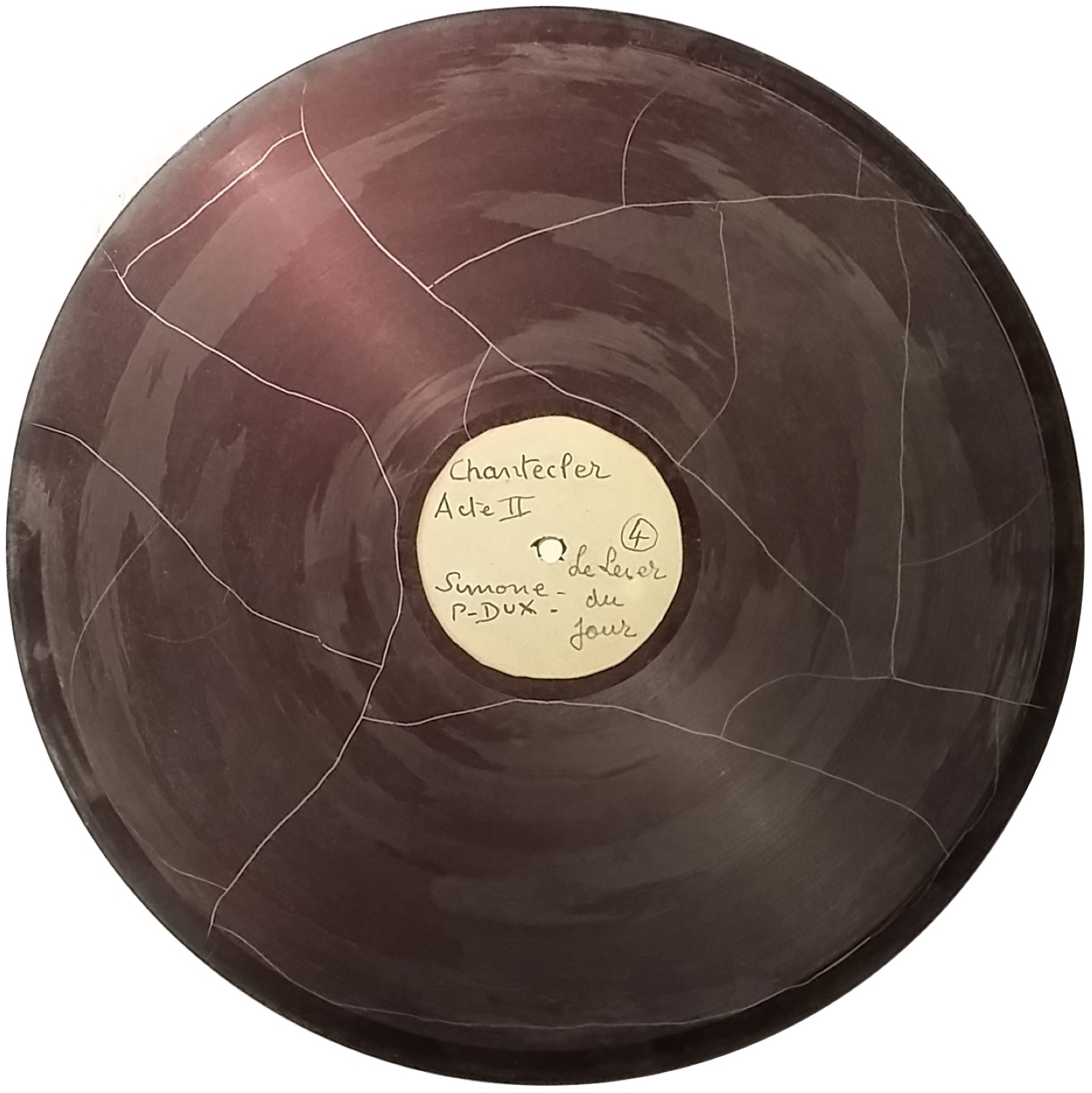 Commentaires :Paroles non transcrites. Une première lecture des faces 1 et 6, alors encore lisibles, a été faite en 2011. La lecture des faces 2 à 5, trop endommagées, a été faite du 11 au 23 décembre 2025 au moyen du procédé de lecture optique SAPHIR, développé à l'INA, voir : Jean-Hugues Chenot, Louis Laborelli, Jean-Étienne Noiré. Saphir: Optical Playback of Damaged and Delaminated Analogue Audio Disc Records. Journal on Computing and Cultural Heritage, 2018, 11 (3), pp.14.1-29. ⟨10.1145/3183505⟩. https://hal.science/hal-01885324. Fragment de l'enregistrement de l'émission radiodiffusée le 12 mai 1946. Distribution : Simone (Pauline Benda, 1877-1985) [elle fut successivement Mme Le Bargy, Mme Casimir-Périer, Mme François Porché] : la faisane ; Pierre Dux : Chantecler ; J.P. Coquelin : le merle ; J. Toulout : Patou. Voir Radio 46, n° 81 du 10 mai 1946, p. 7 et 11 : https://gallica.bnf.fr/ark:/12148/bd6t54317223n/f14 et https://gallica.bnf.fr/ark:/12148/bd6t54317223n/f11 pour plus de détails autour de la radiodiffusion de la pièce, le 13 mai 1946, programme parisien, 21h00.