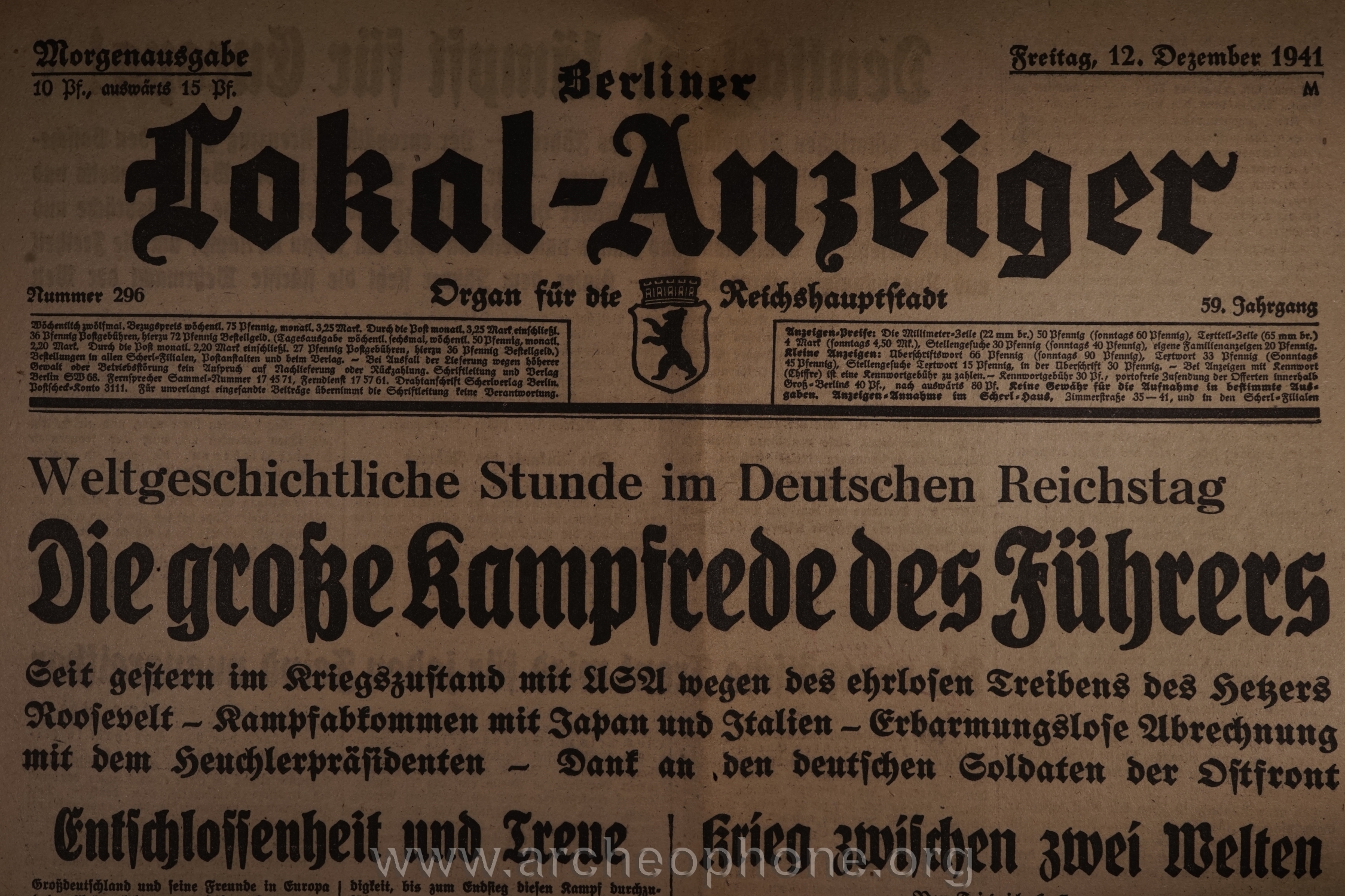 | Titre : | Rede vor dem Reichstag zur Bekanntgabe der Kriegserklärung an die USA - 11-12-1941 (1) | ||||